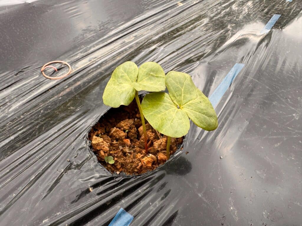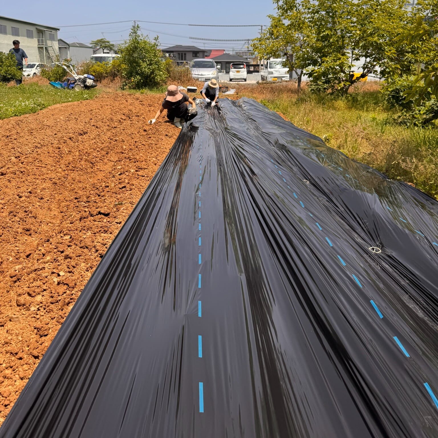 畝ができたらマルチシートを敷いていよいよ種まきです。
